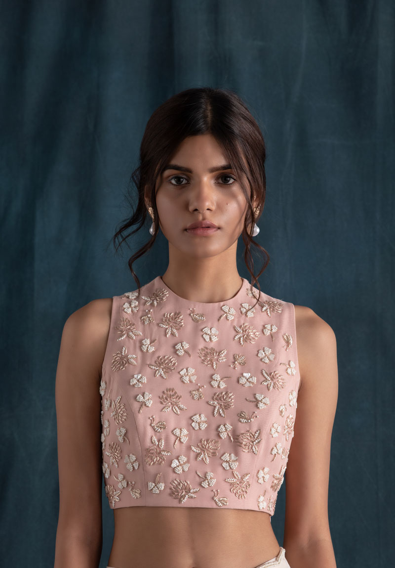 This blush and ivory pre-stitched saree includes a pleated wrap skirt in georgette with an attached silk organza drape, featuring a beaded scallop border and scallop detailing on the pleats. It comes with a georgette blouse in blush, embroidered with light golden dabka and ivory beads and sequins, along with a satin petticoat.