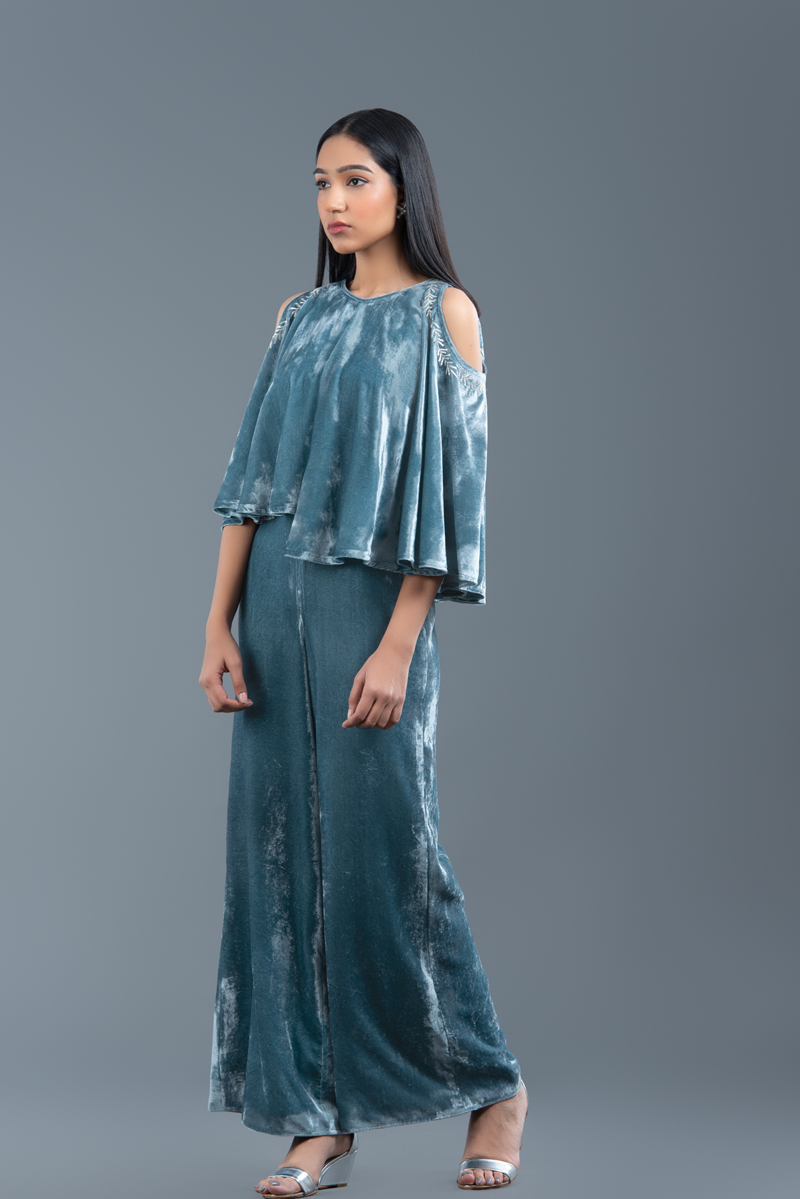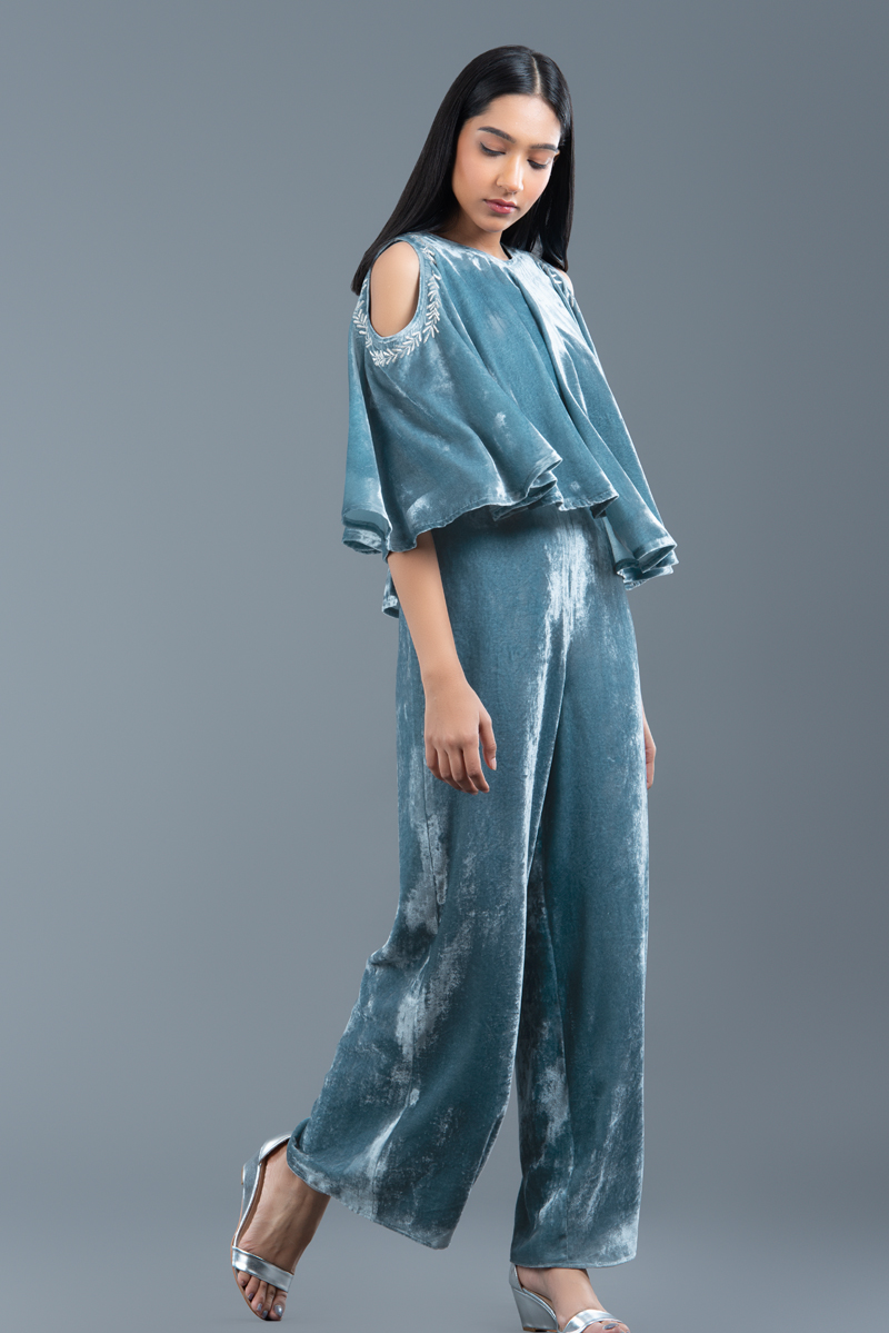 This set includes a sleeveless jumpsuit with a fitted bodice and a separate asymmetrical cold-shoulder cape with embroidery on the shoulder cut-outs.