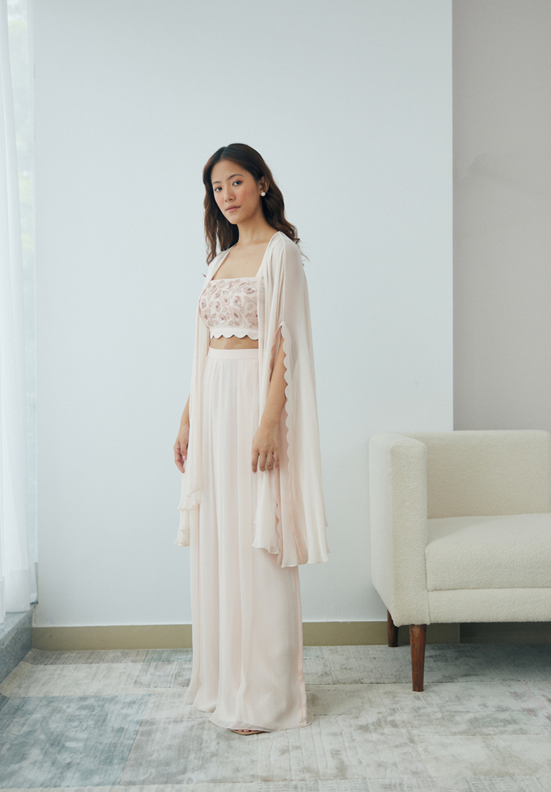 This set includes an ivory crop top with a fitted bodice in linen satin and gathered billow sleeves in silk organza, and ivory pleated pants in linen satin with a wide pleated waistband and our signature scallop trim.