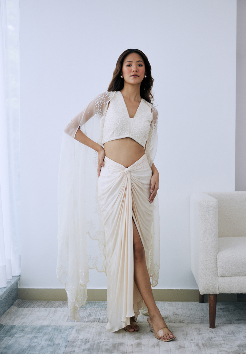 This set includes a full-sleeved kurta in satin linen with beaded organza panels. It comes with a beaded silk organza dupatta with a scalloped border and is finished with a delicate lace trim.