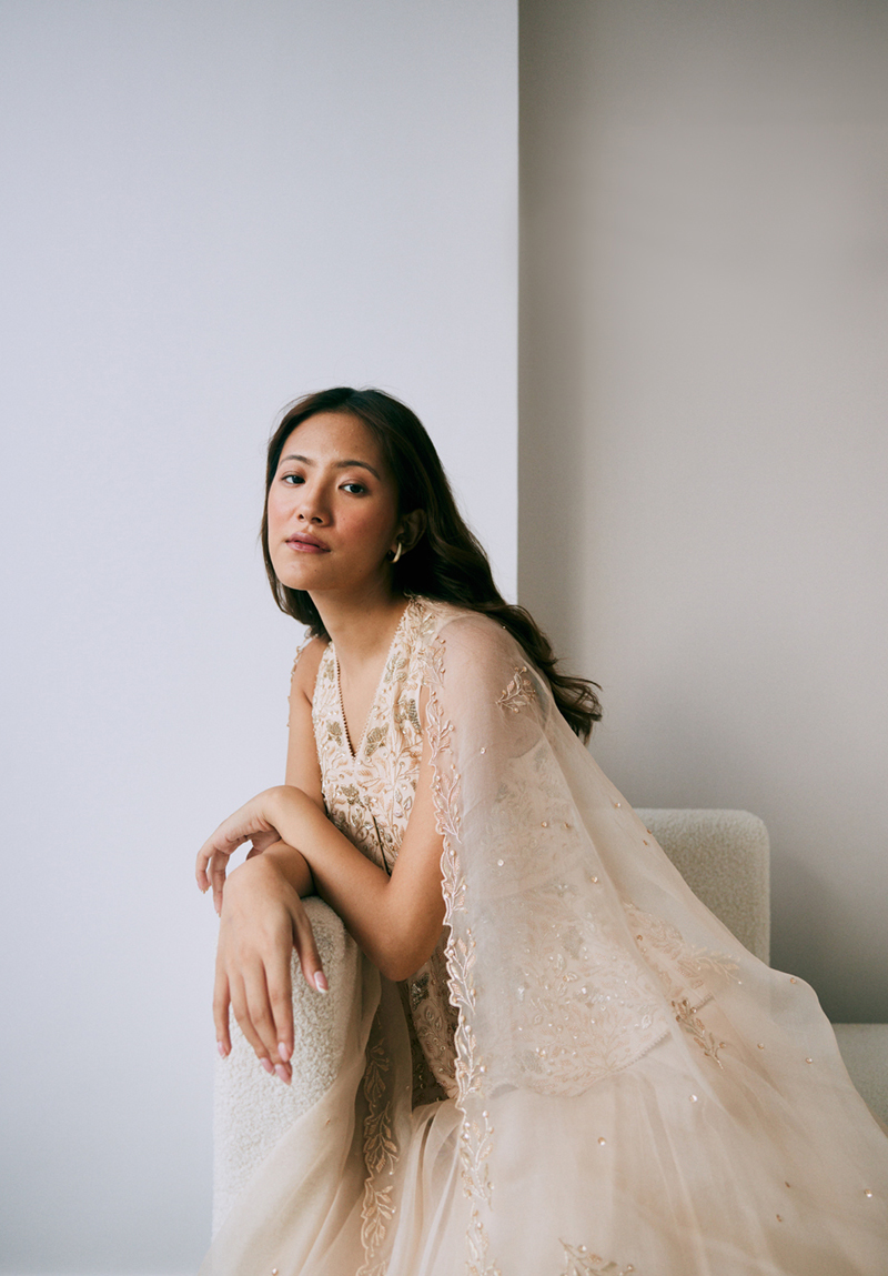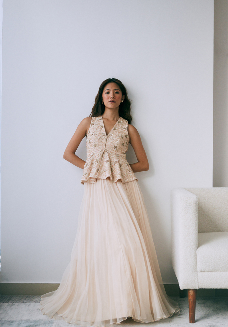 This set includes a sleeveless peplum blouse and a soft-volume gathered skirt in silk organza. It is paired with an embroidered silk organza dupatta with a beaded cutwork border.
