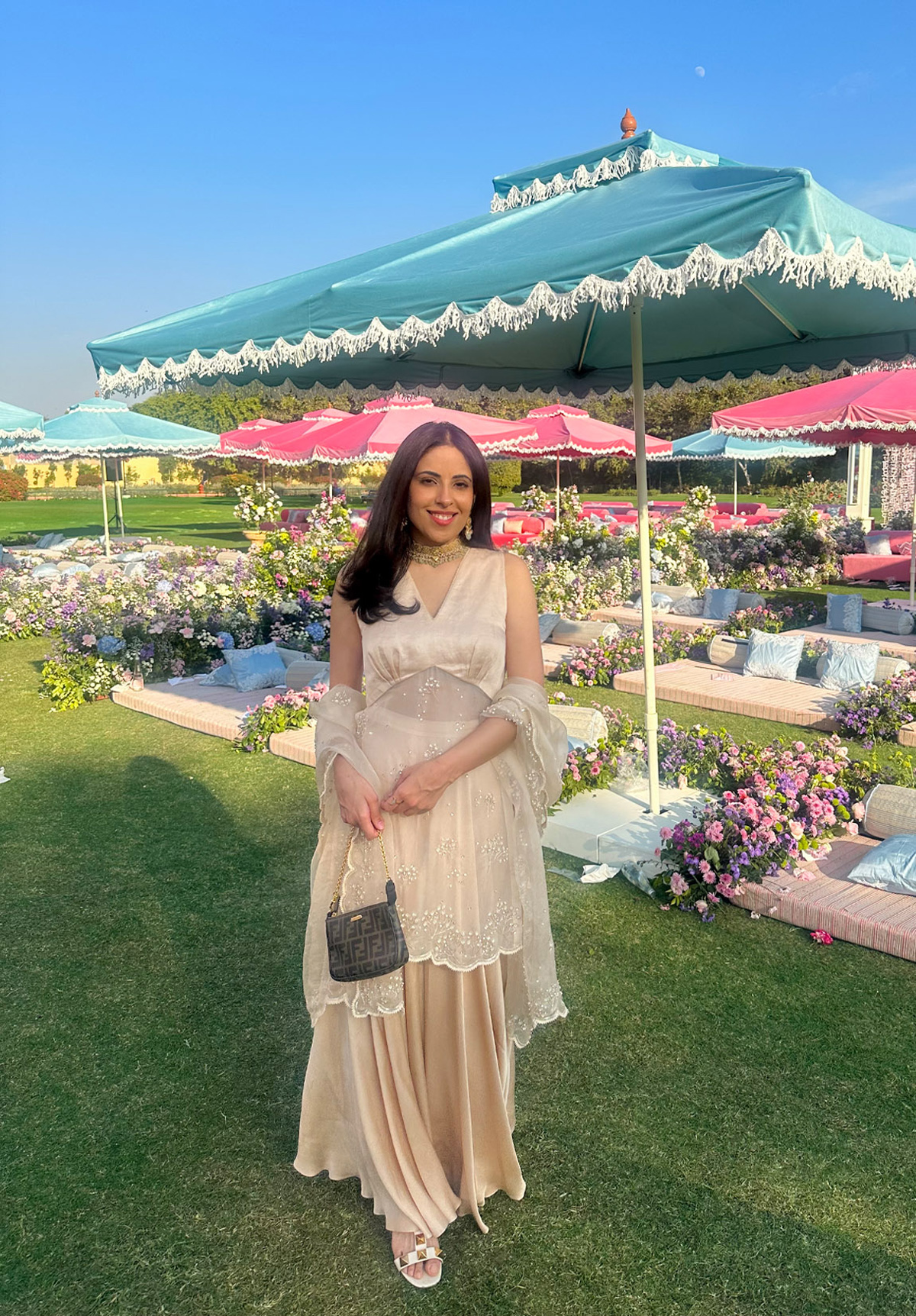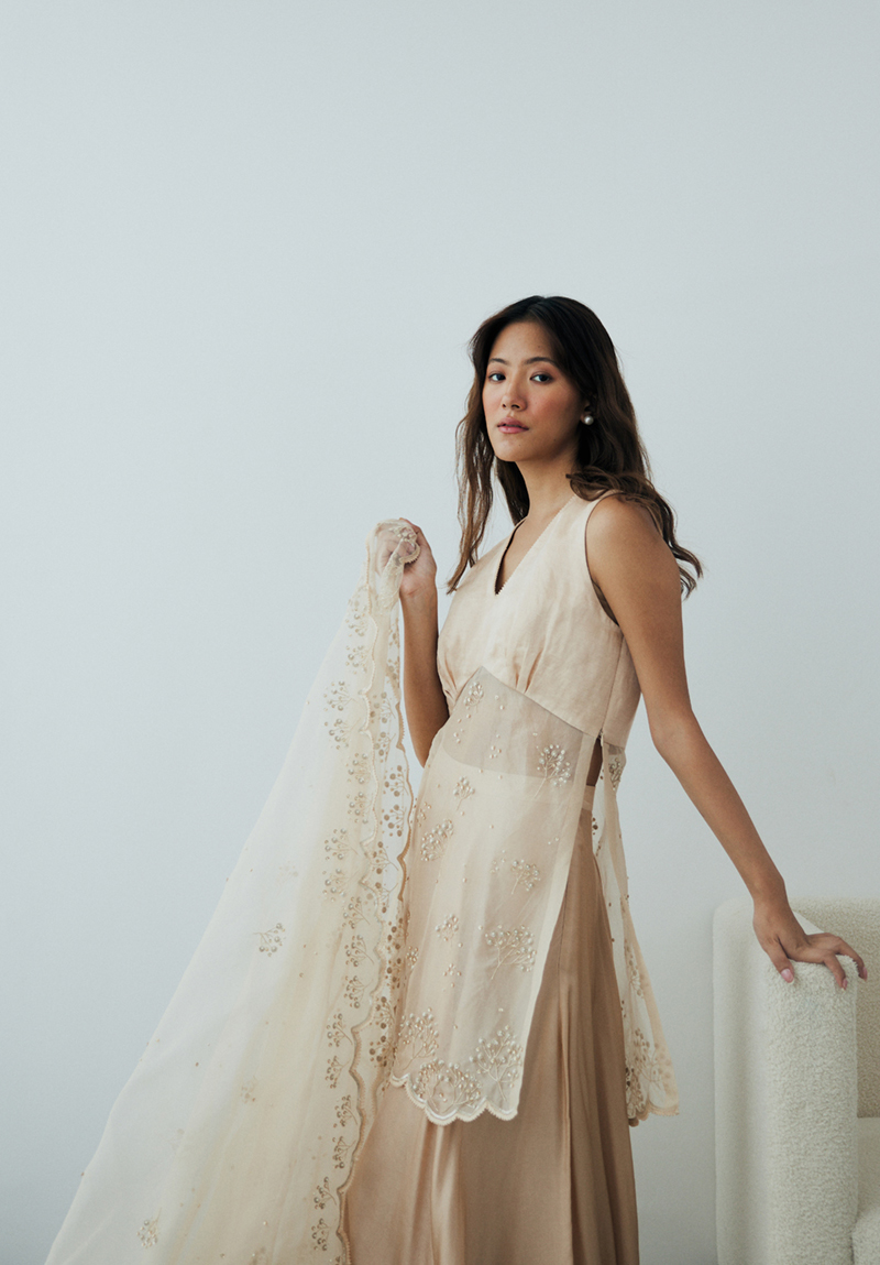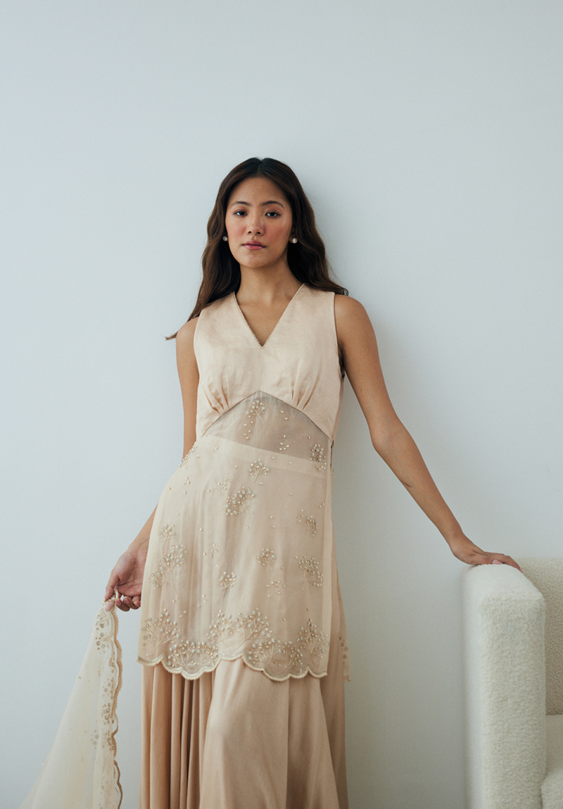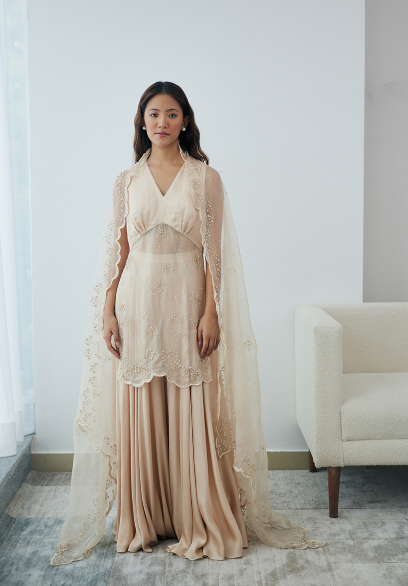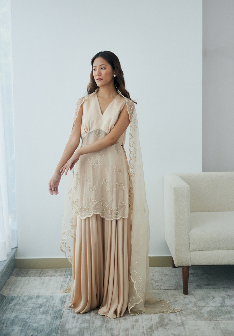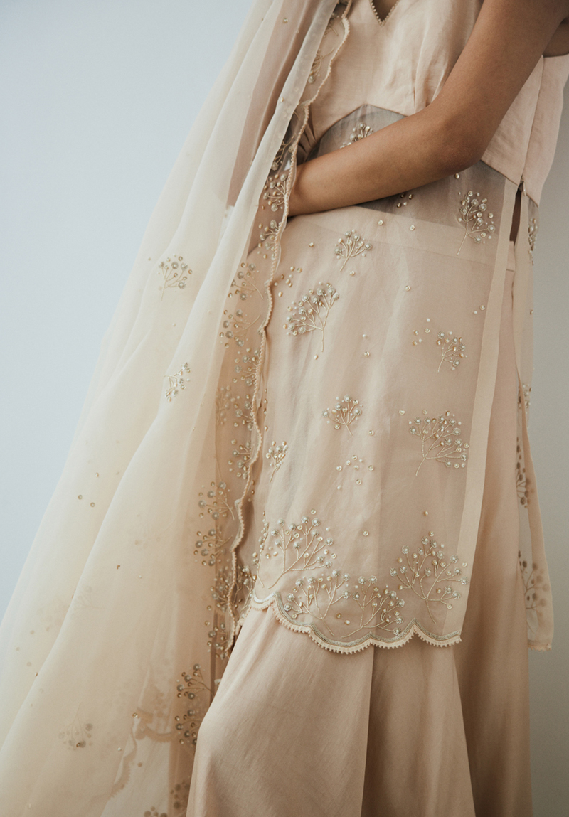 Our take on the traditional sharara set, this set includes a short tunic in silk organza and linen satin, full bias pants in satin and a silk organza dupatta with an irregular cloud-like scalloped border.