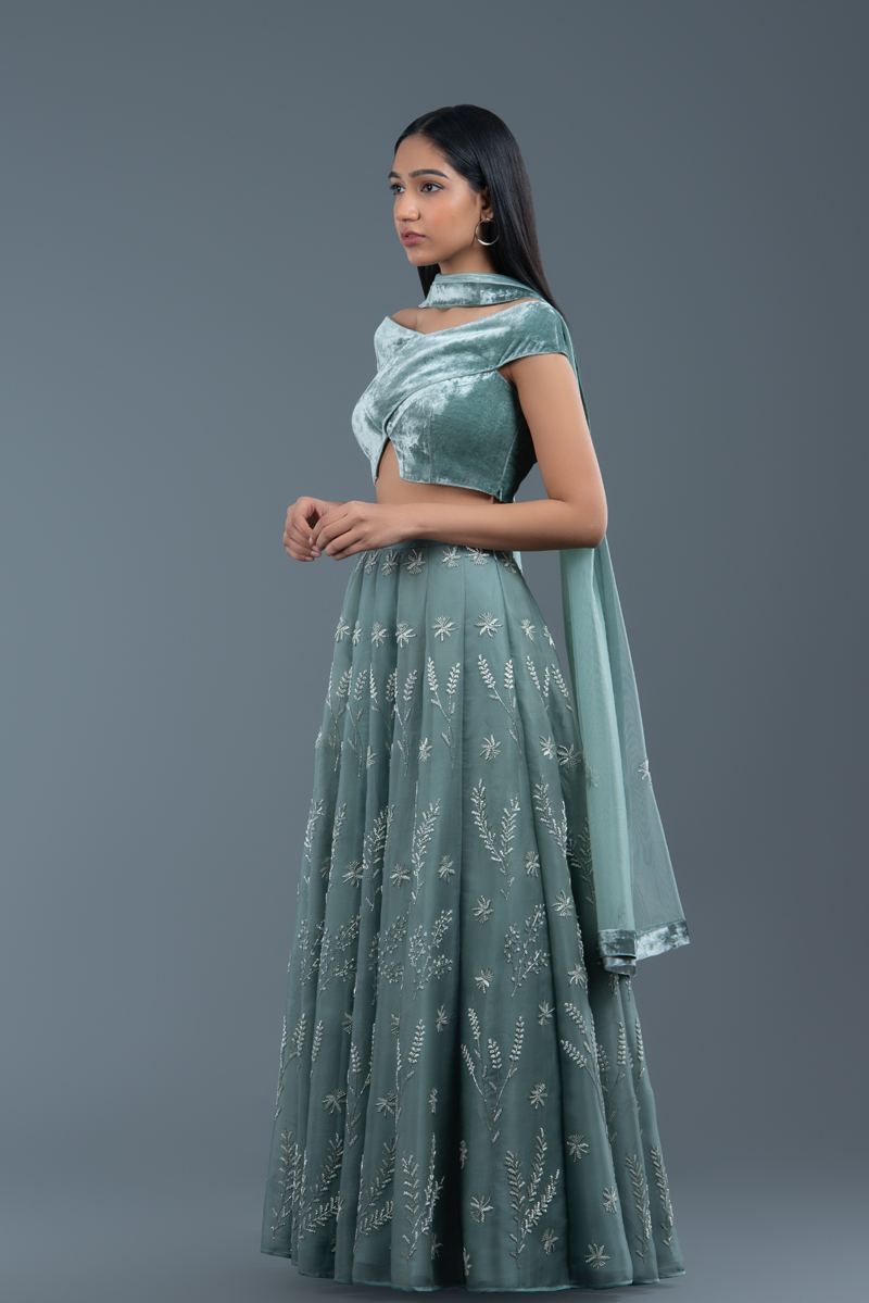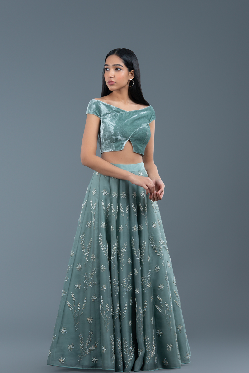 This lehenga set includes a panelled satin organza skirt featuring our signature rosemary-lavender-thyme embroidery all over. It is paired with an off-shoulder overlap panel blouse in silk velvet with a v-shaped cut out at the waist, and a lightly embellished dupatta in net.