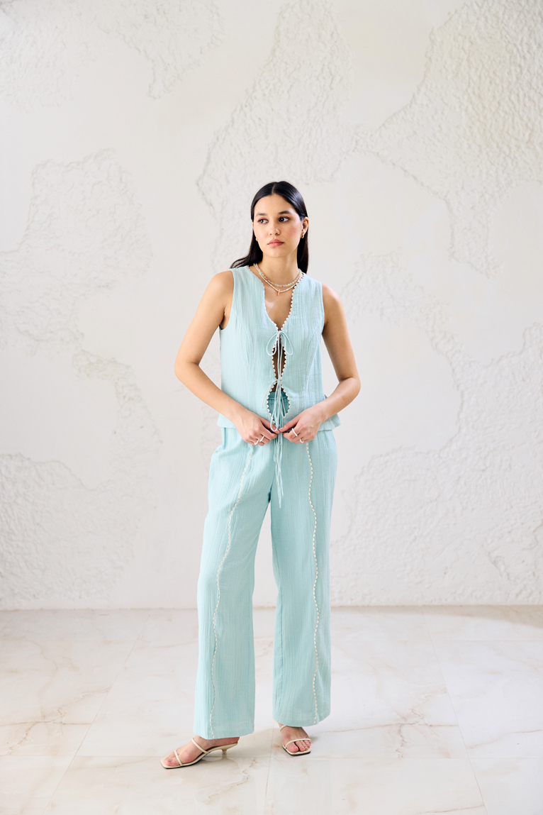 This set includes a sleeveless front-open top with wave neckline and features soft-tie closures in airy cotton double gauze.